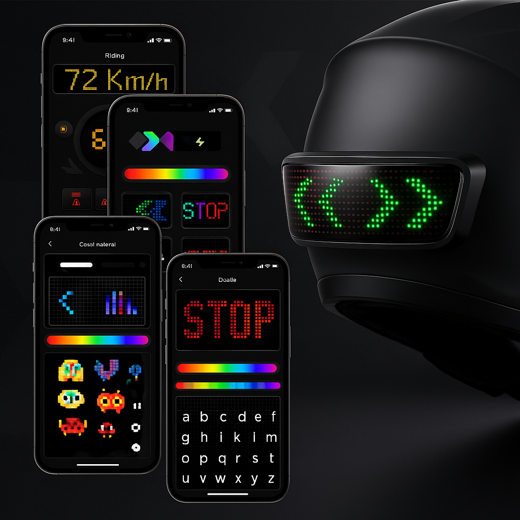 Switch between 5+ modes in the app: speed display, turn arrows, scrolling text, music-sync animations & more. Save your favorite presets for different rides.